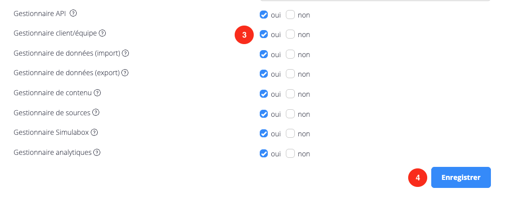 - (3) Cochez “Oui” à côté de “gestionnaire client/équipe”.