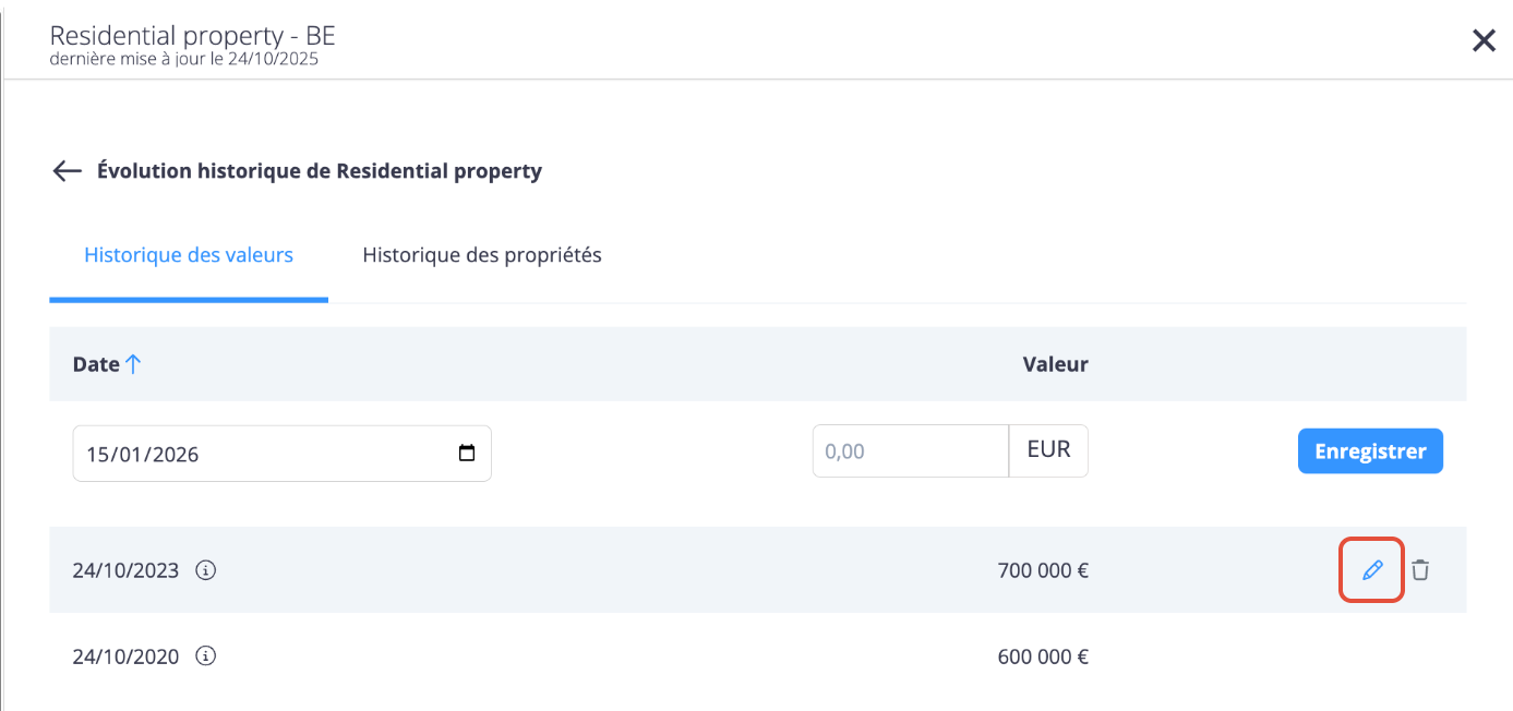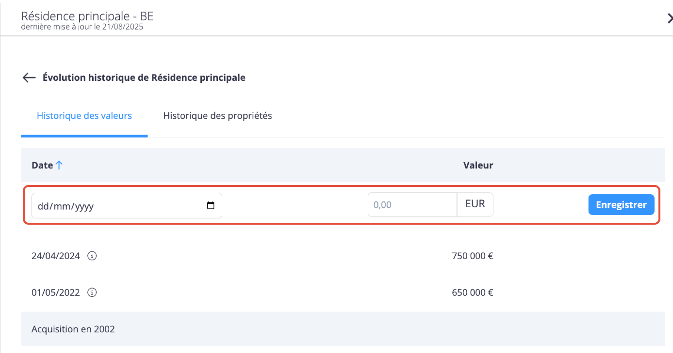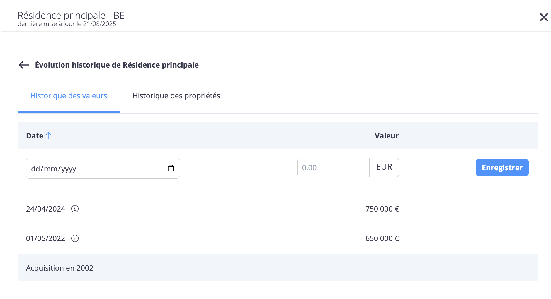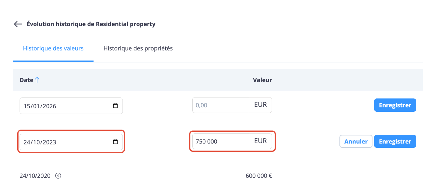 L'historique de valeur permet de documenter les changements de valorisation d’un bien dans le temps.
