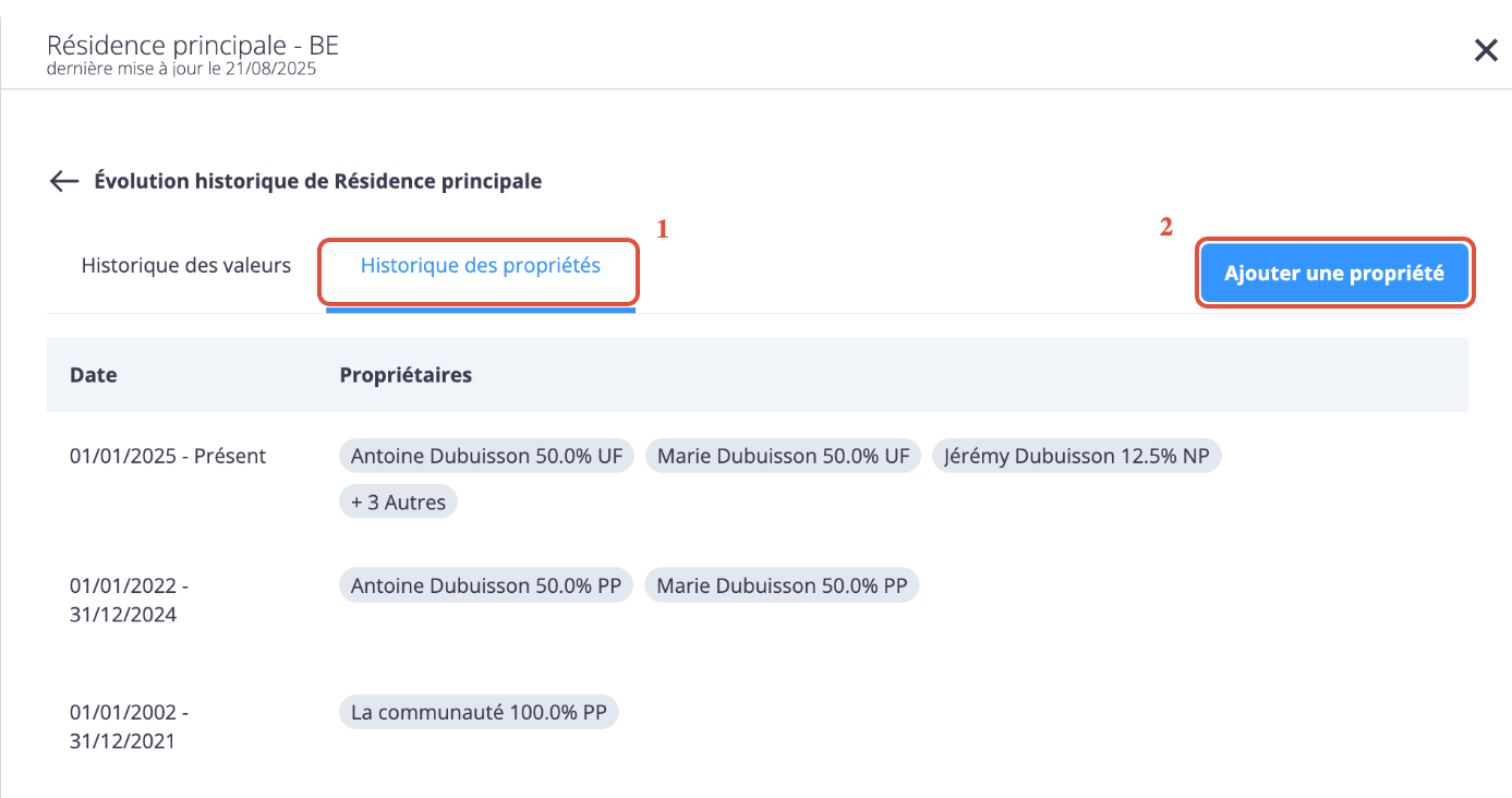 Pour ajouter un nouveau changement de propriété historiques ou modifier la propriété actuelle du bien: