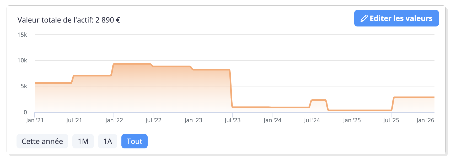 Le client final peut aussi modifier la valeur d'un actif depuis la version mobile de la plateforme, cela créera un point dans l'historique à la date de modification (s'il modifie 2 fois sur la journée, cela mettra la valeur à jour à cette date).