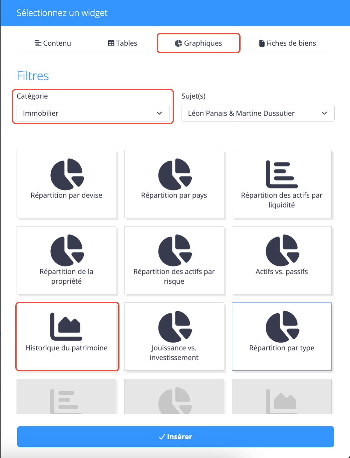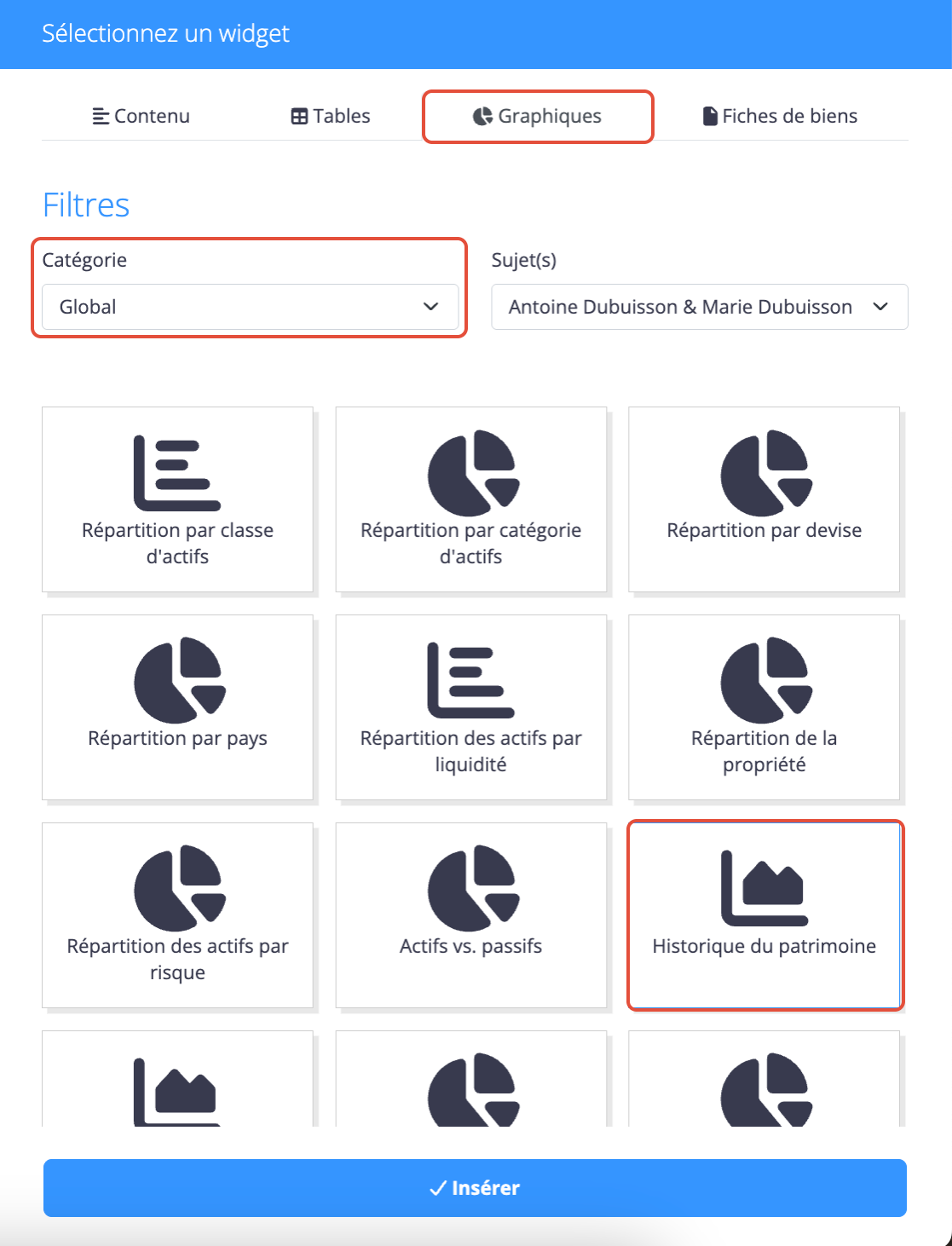 Le graphique d'évolution de la valeur du patrimoine global se trouve dans les widgets "Graphiques", dans la catégorie correspondante, Historique du patrimoine.
