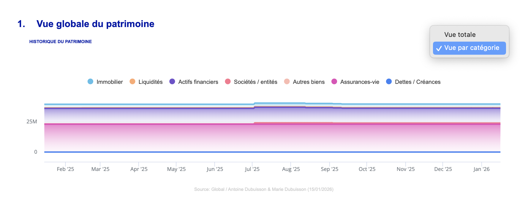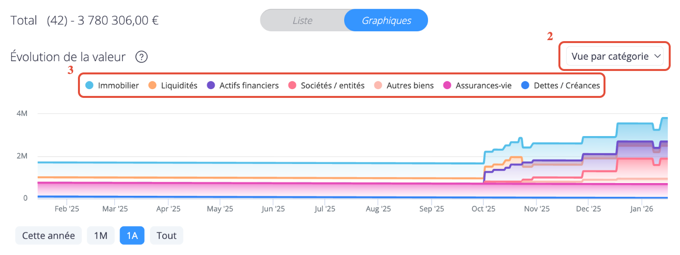 1. "Vue totale" qui représente une seule courbe reprenant l'évolution historique de la somme de tous les actifs du patrimoine.