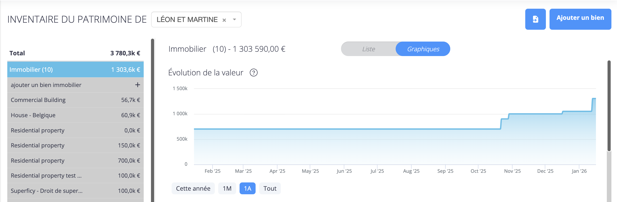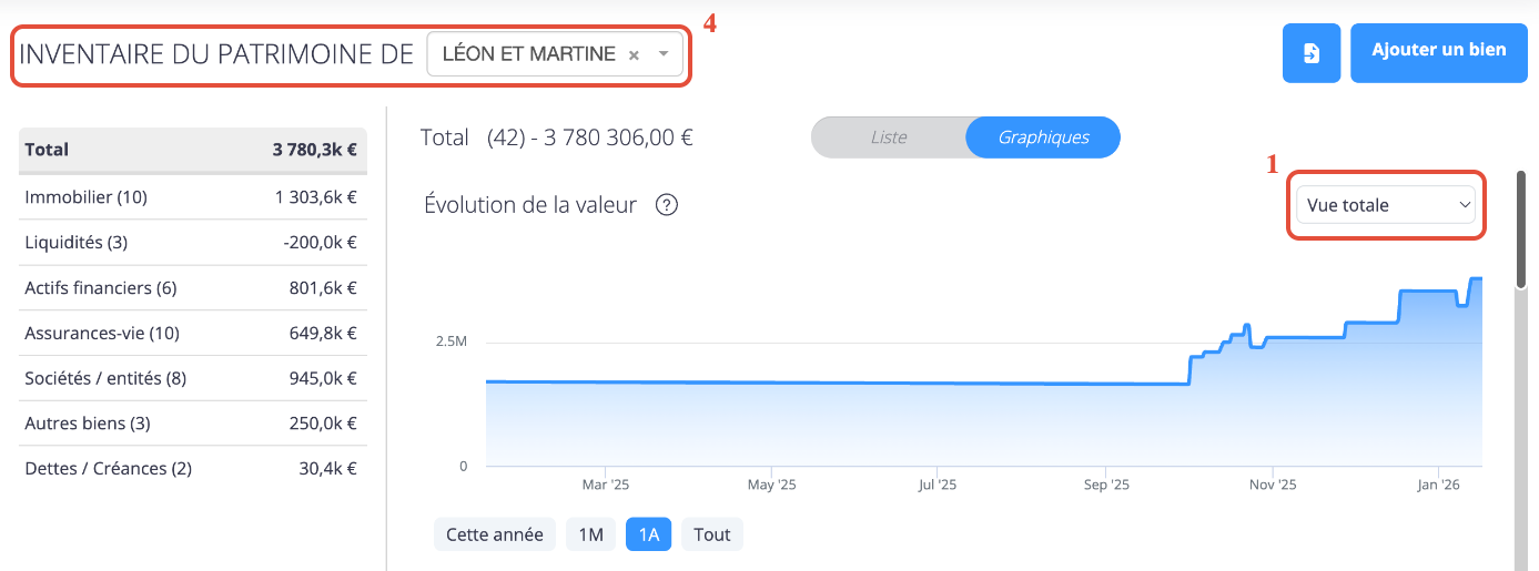 Le graphique évoluera en fonction de la personne physique ou morale sélectionnée dans dans le menu déroulant "Inventaire du patrimoine de ..." et de la catégorie d'actif sélectionnée dans la liste de gauche.