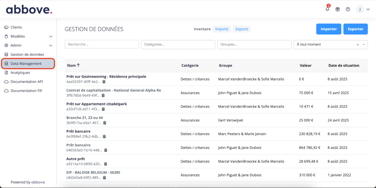 L’outil Data Management est accessible depuis le menu de gauche de l'interface conseiller dans votre environnement Abbove.