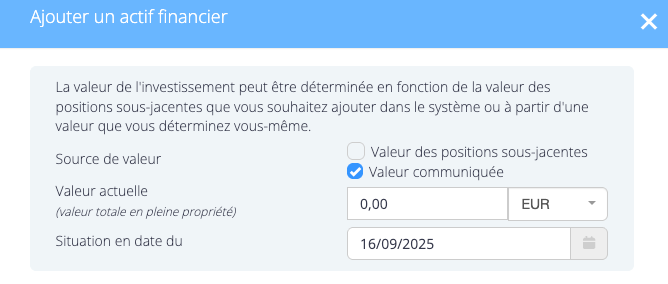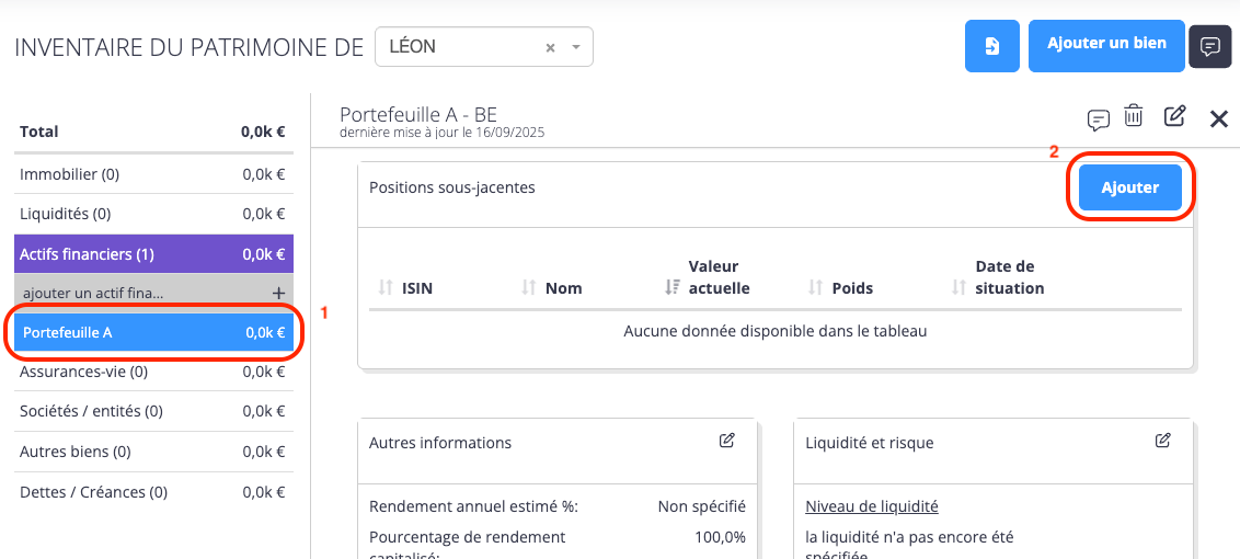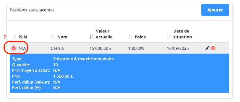 Pour ajouter manuellement une position sous-jacente à un actif financier ou une assurance-vie :