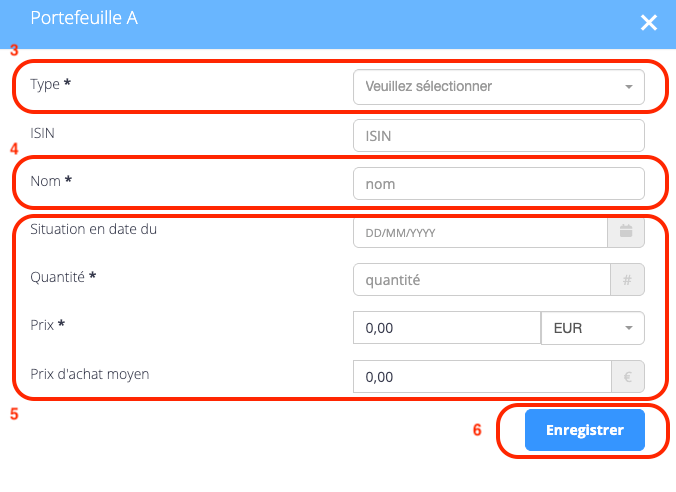(5) Remplissez les champs du formulaire (ISIN, Date de situation, Quantité, Prix, Prix d’achat moyen)