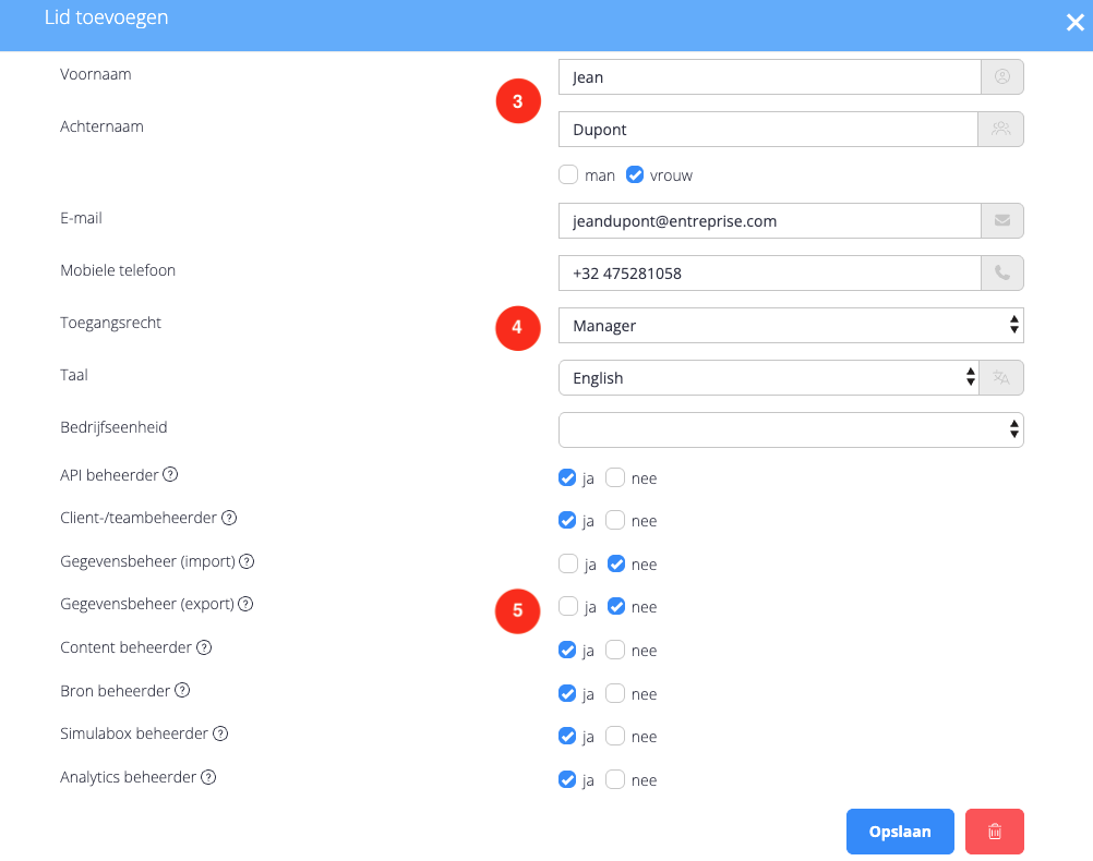 - (4) Kies het toegangsrecht van het nieuwe lid (manager of support).