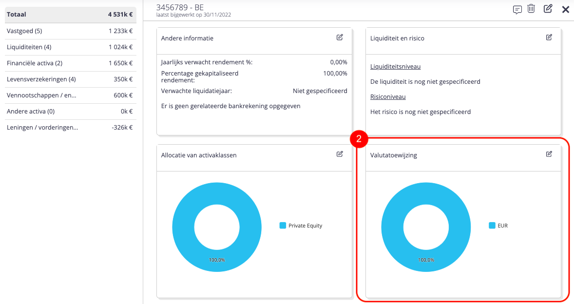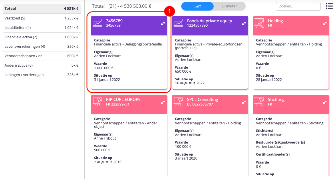 - (1) Klik op de portefeuille (1) waarvan u de gegevens wenst te wijzigen. Het detail van het actief wordt dan geopend.