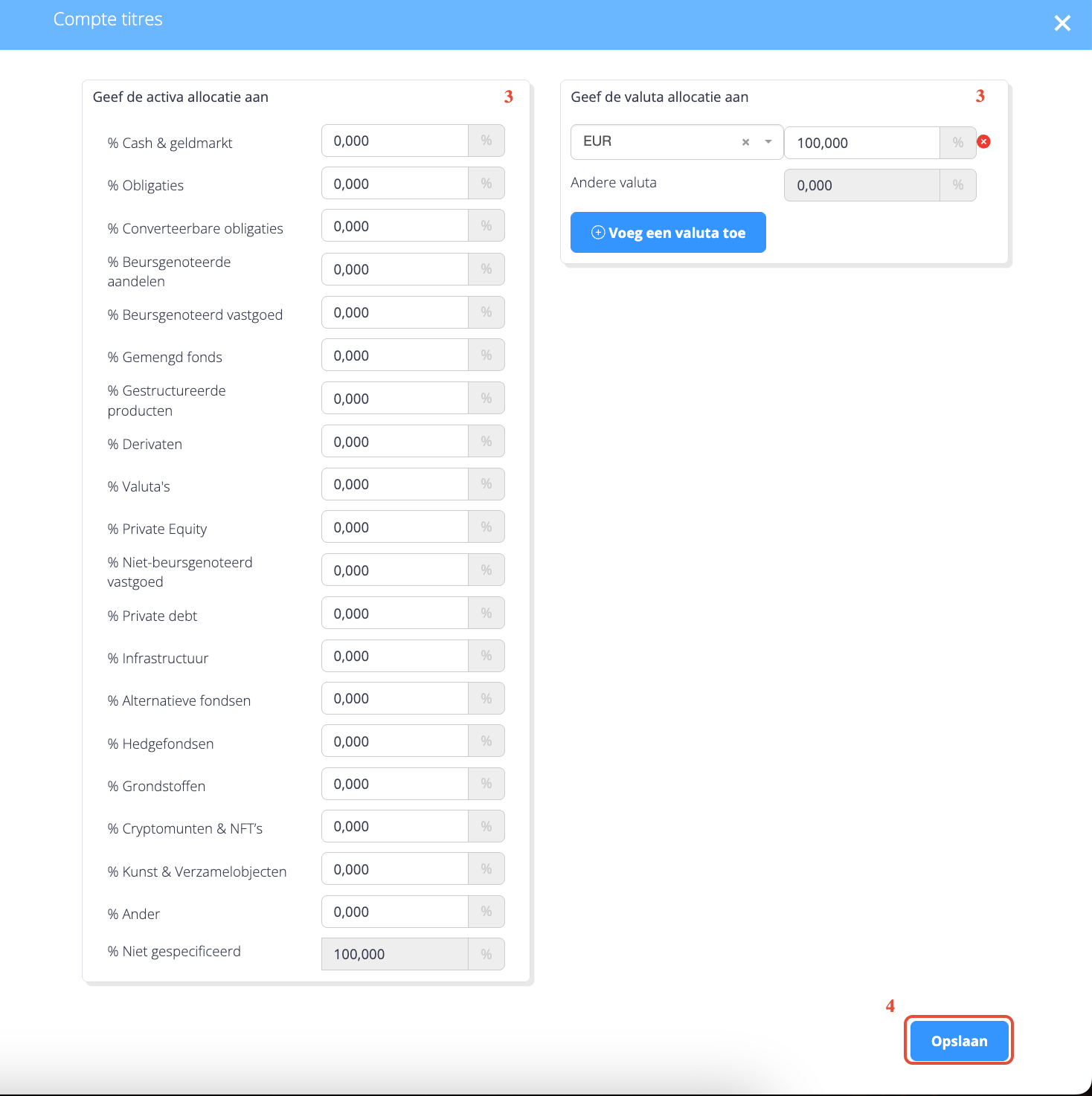 De verdeling per valuta van een portefeuille of verzekering die is ingevoerd in de vermogensinventaris kan op twee manieren worden bijgewerkt:
