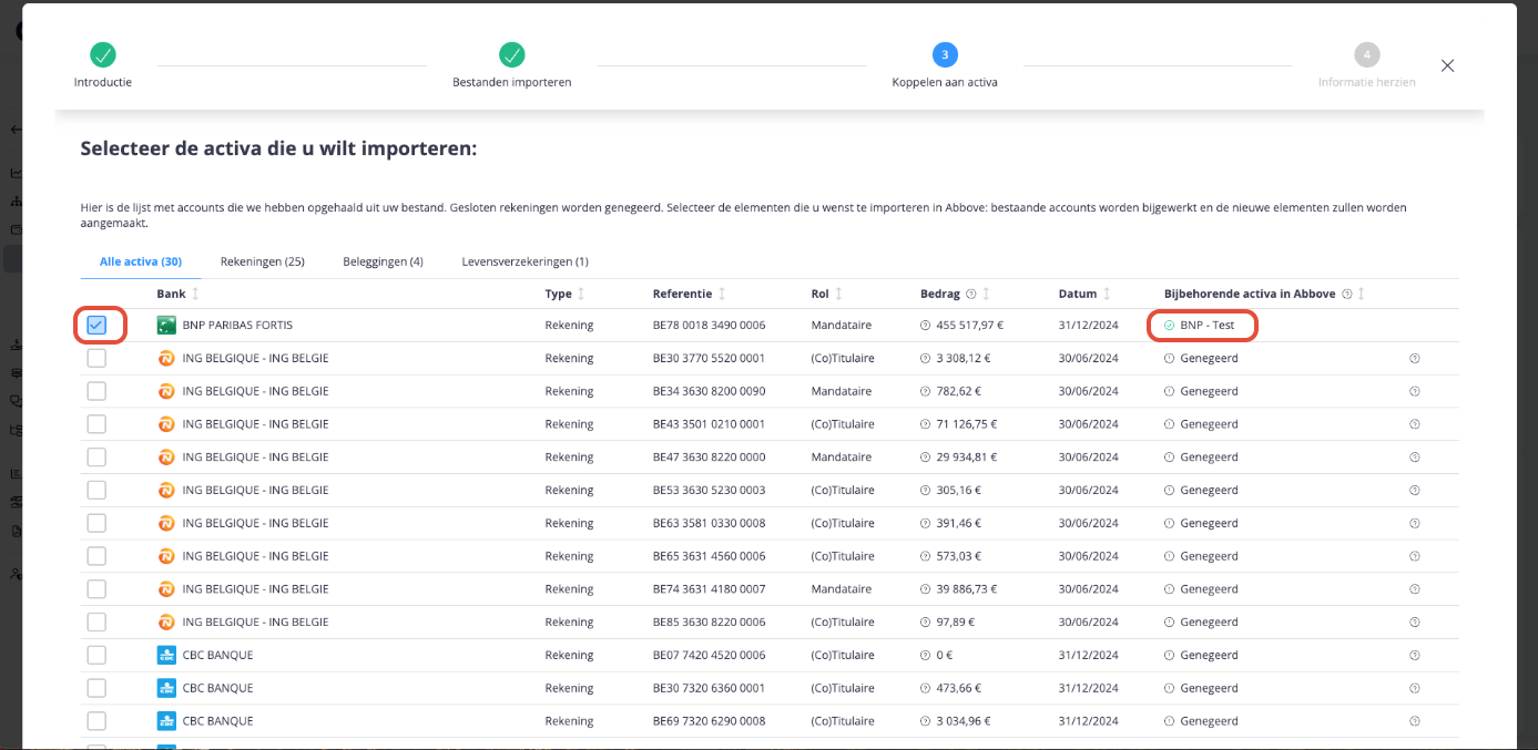 Selecteer de activa die u wenst te importeren door de weergegeven items aan of uit te vinken.