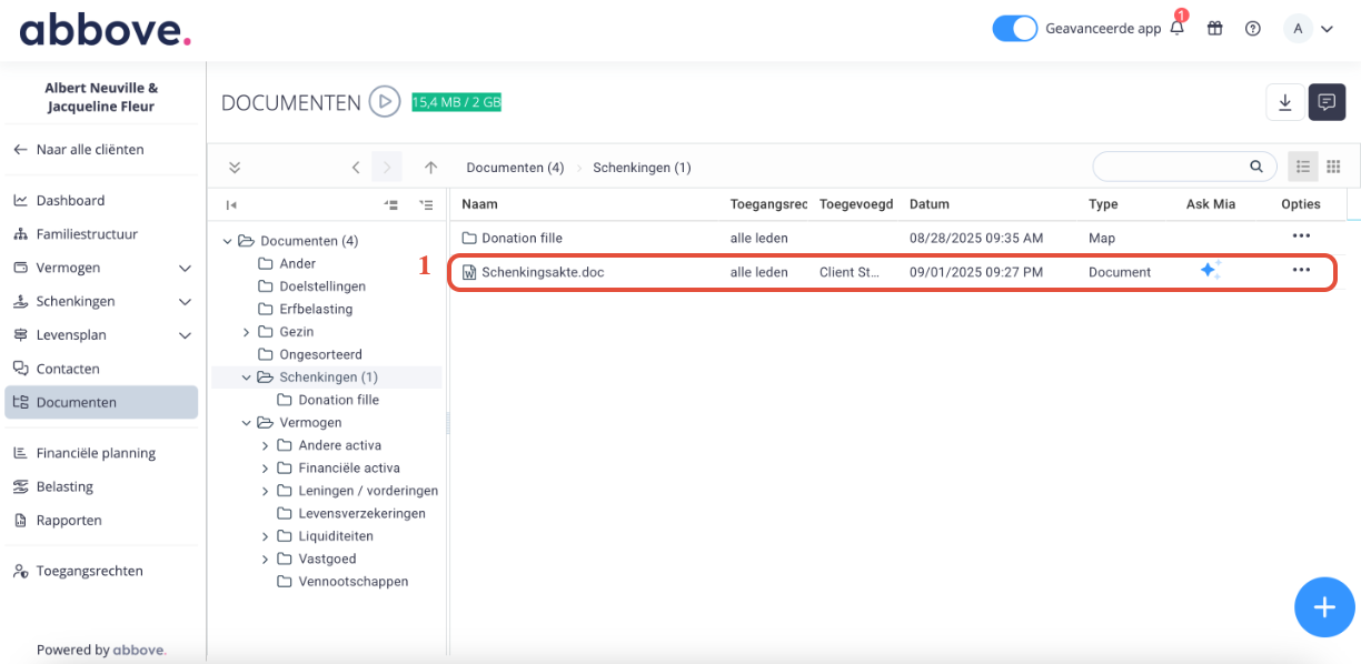 (1) Upload het document in de juiste map in de digitale kluis van het klantendossier.
