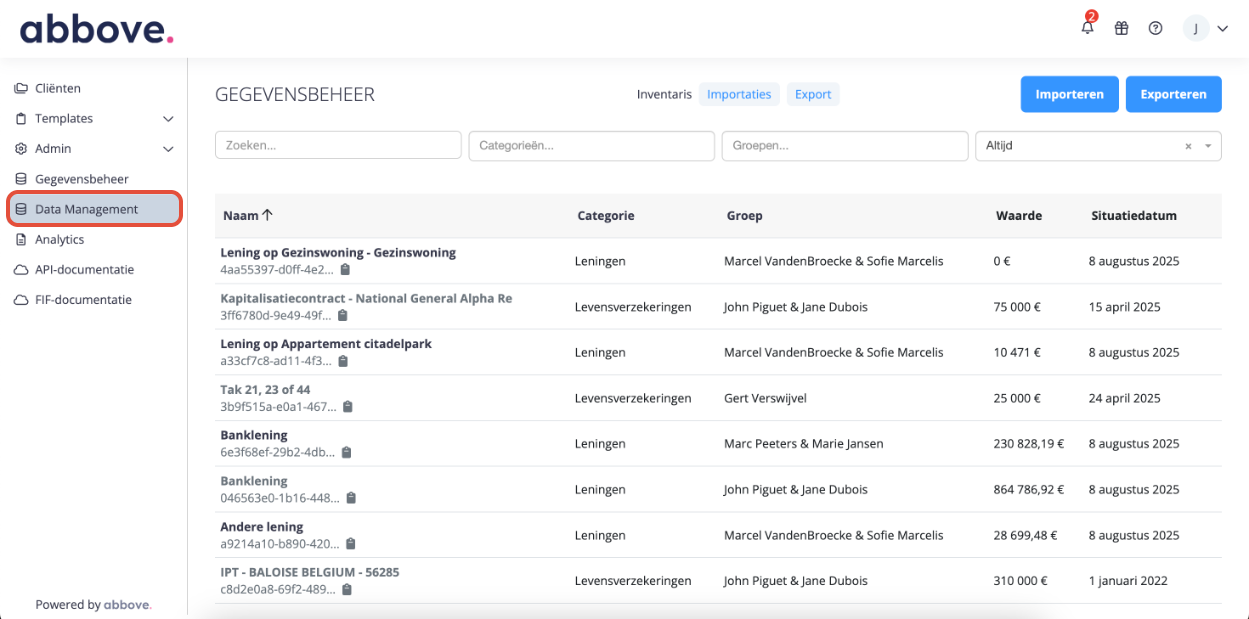 De Data Management-tool is toegankelijk via het menu aan de linkerkant van de adviseursinterface in uw Abbove-omgeving.