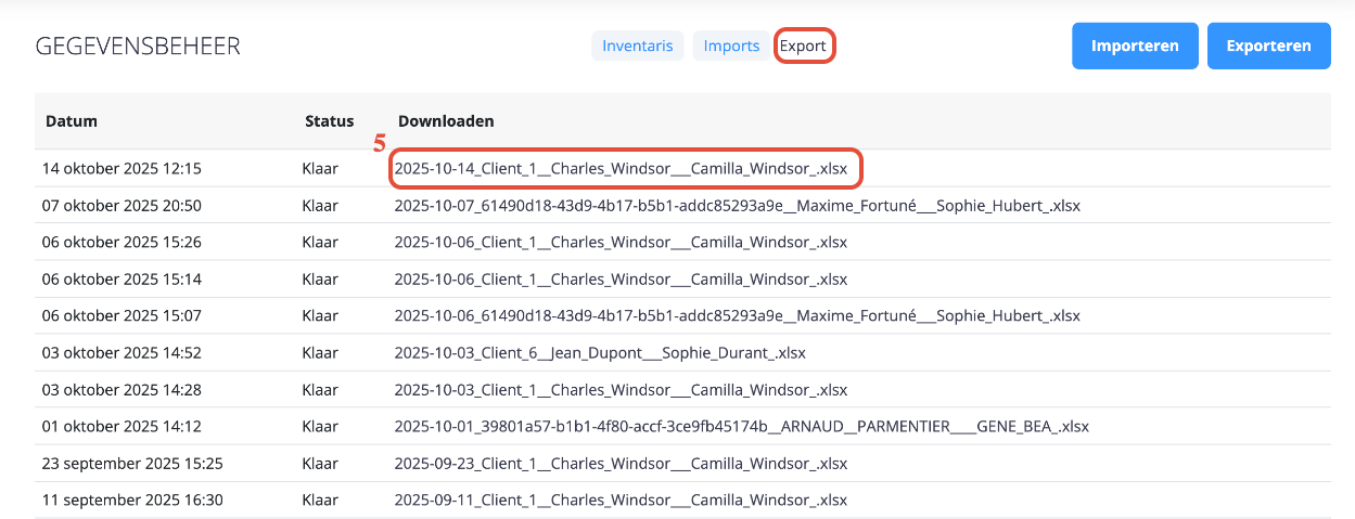 (5) U wordt doorgestuurd naar het scherm Exports, waar het overzicht staat van alle uitgevoerde exports.
