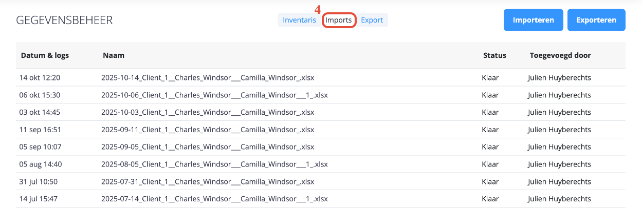 (4) Na de import wordt u doorgestuurd naar de pagina Imports, waar het overzicht staat van alle geïmporteerde bestanden.