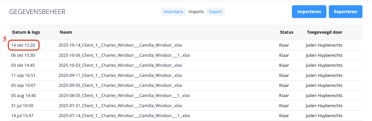 (5) U kunt de status van uw import en de importlogs bekijken door op de datum en tijd van het bestand te klikken.