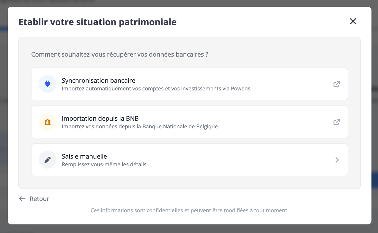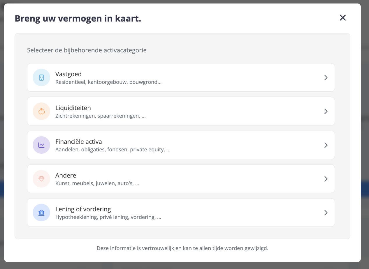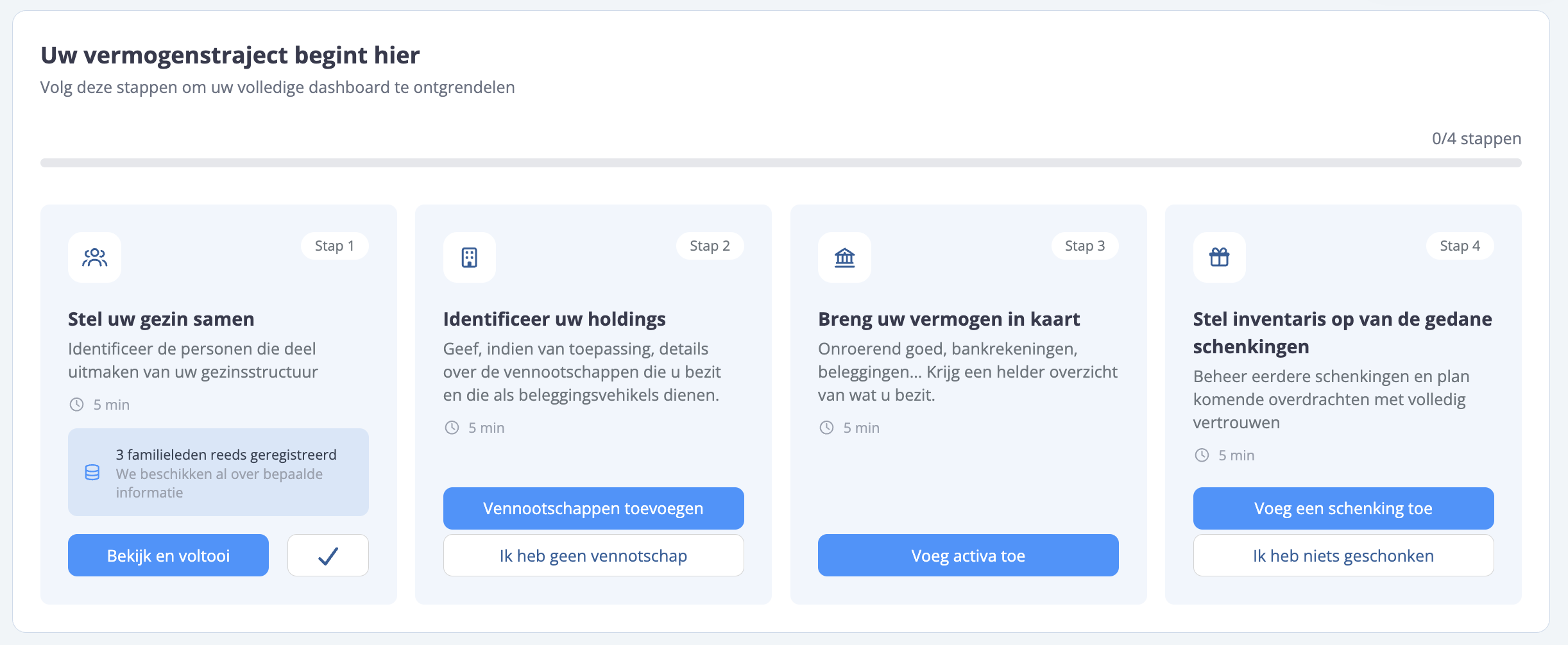 Het vermogenstraject stelt de eindklant in staat om autonoom zijn persoonlijke en vermogensgegevens te controleren, aan te vullen en te bevestigen, via een begeleid proces in 4 stappen.