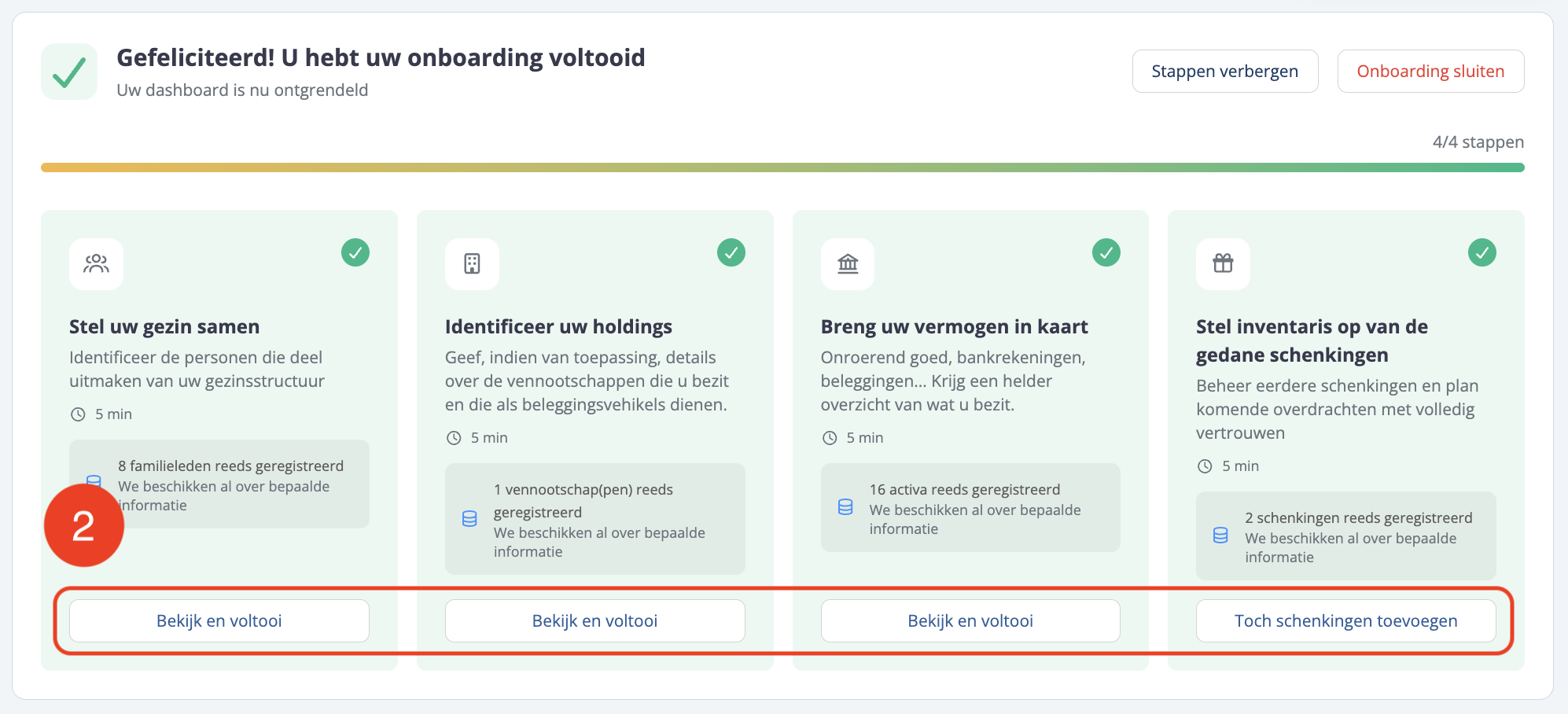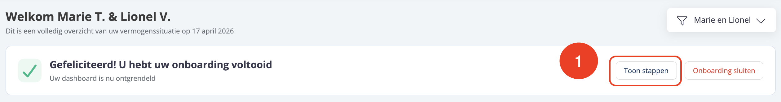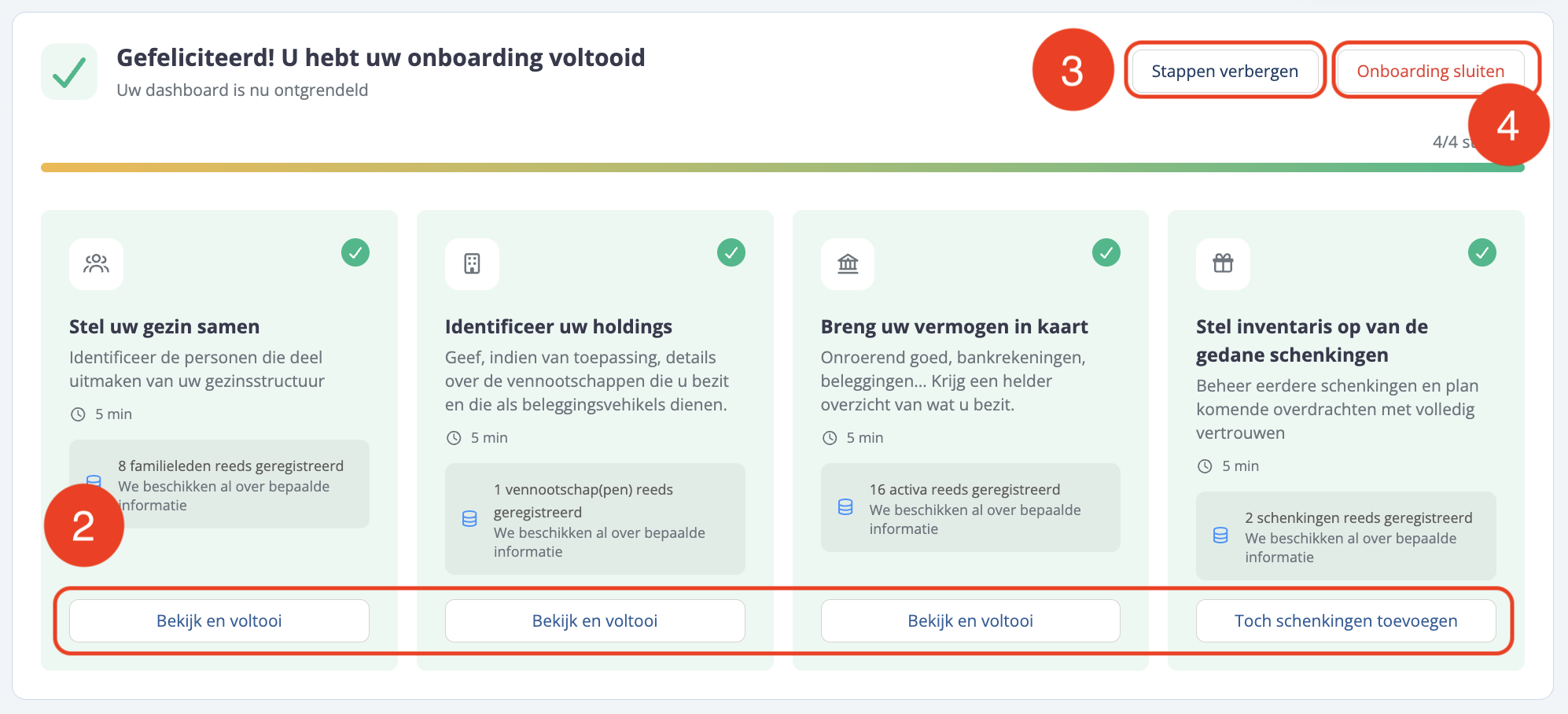 (4) U kunt ervoor kiezen om de onboarding te negeren, dan zullen de stappen van het vermogenstraject niet langer zichtbaar of toegankelijk zijn voor u en uw klanten.