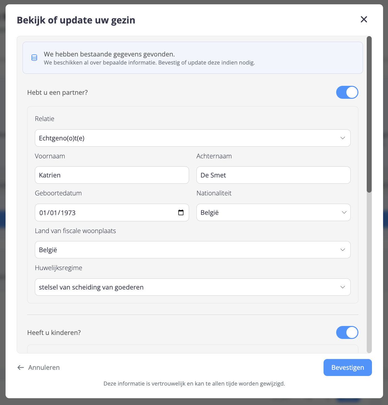 De eerste stap nodigt uit om de familiestructuur te controleren en te bevestigen. Het is de bedoeling na te gaan of de volgende informatie correct is en deze indien nodig te valideren, aan te vullen en/of te wijzigen:
