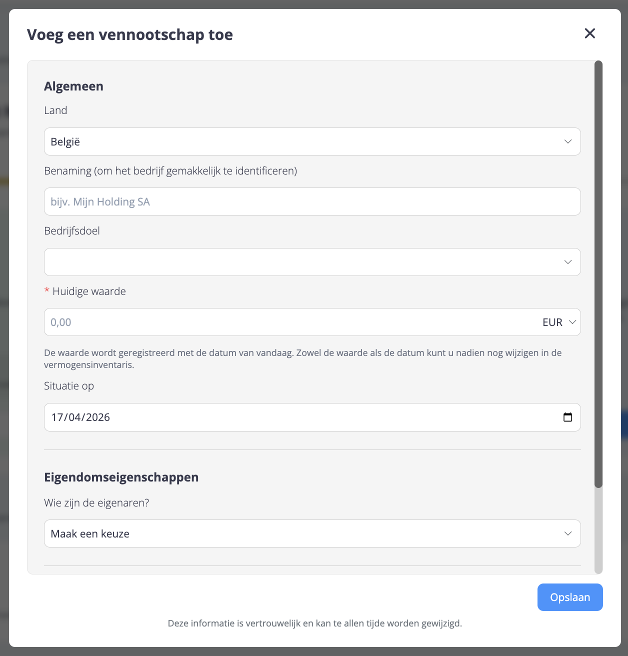 - Indien ja: de informatie van elke vennootschap wordt ingevoerd via een vereenvoudigde kaart (naam, rechtsvorm, kerngegevens).