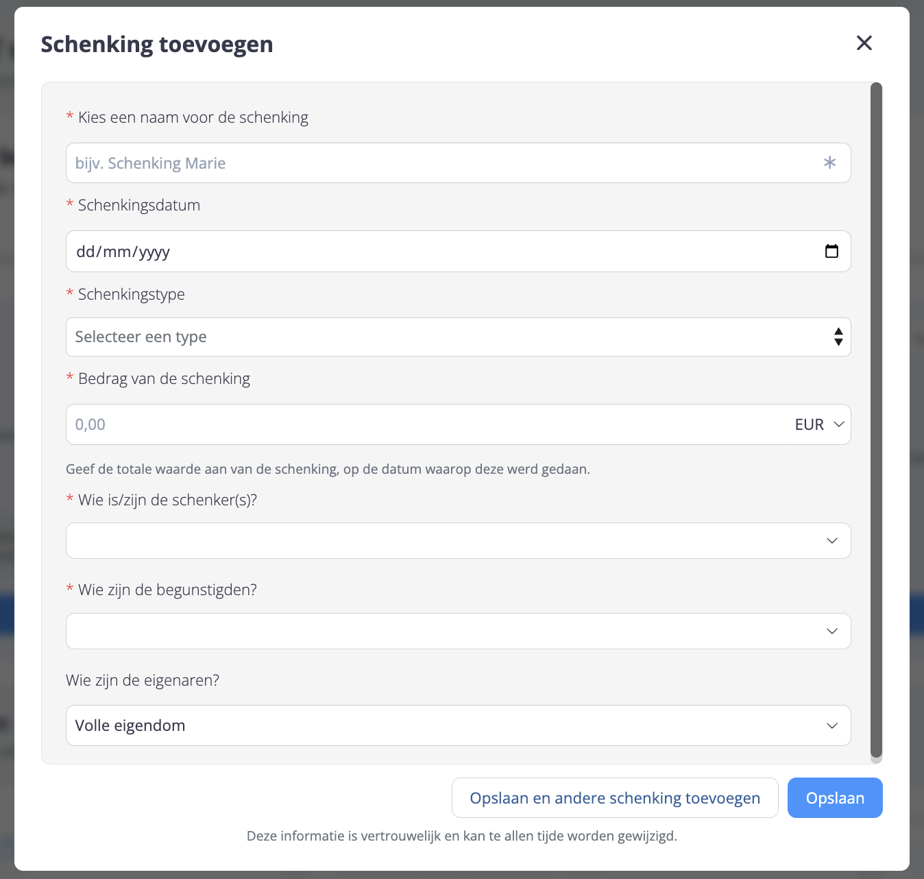 - Als er al schenkingen zijn gedaan: deze worden in deze stap ingevoerd of gecontroleerd.